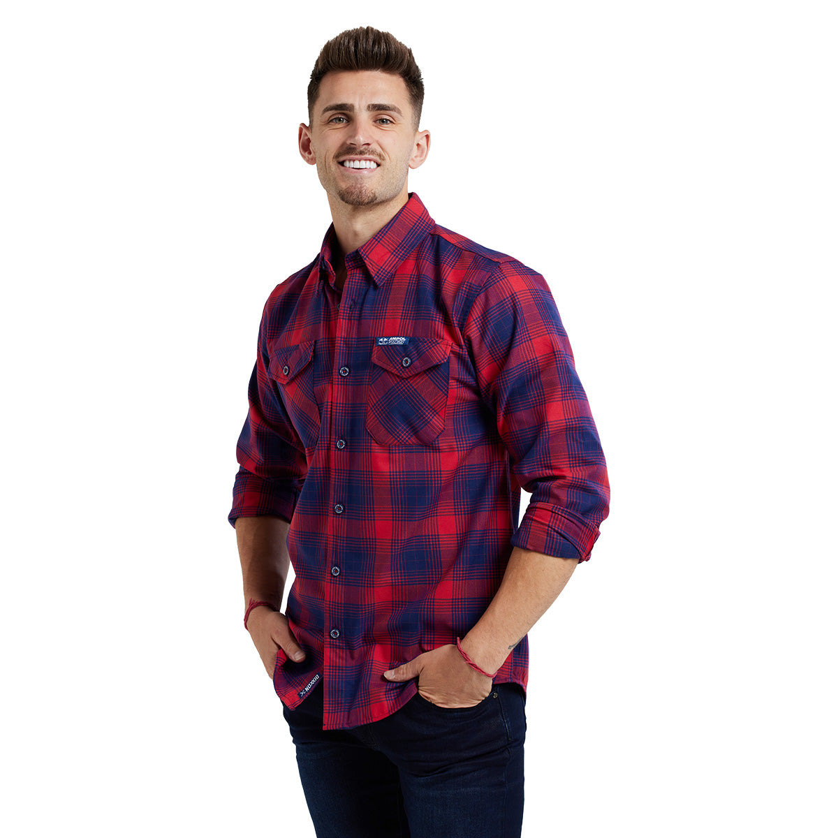 - Dual Chest Button Down Pockets with Brand Tag on Left Chest Pocket